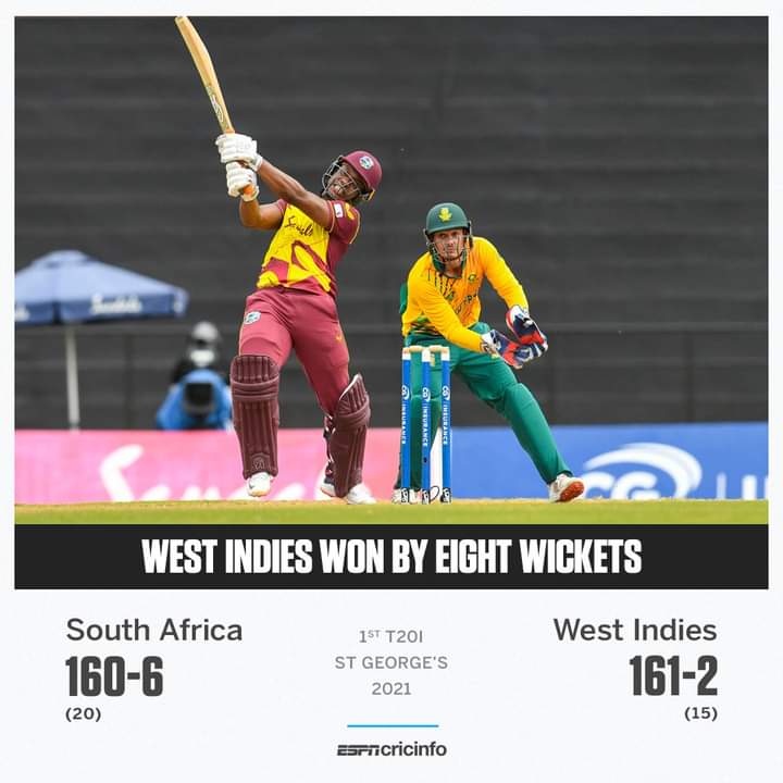 முதல் T20 தென் ஆப்பிரிக்காவை 8 விக்கெட் வித்தியாசத்தில் வீழ்த்தியது வெஸ்ட் இண்டீஸ்