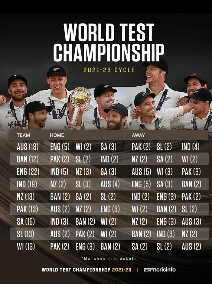 இந்த நிலையில், தற்போது 2021-2023ஆம் ஆண்டிற்கான டெஸ்ட் சம்பியன்ஷிப் தொடருக்கான அட்டவணை வெளியாகியுள்ளது.